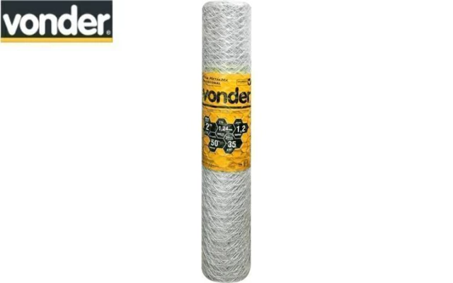 | Característica | Descrição | |---------------------|--------------------------------| | Malha | Hexagonal 2" | | Calibre do fio | 18 BWG (aprox. 1,2 mm) | | Altura | 1,20 metros | | Comprimento do rolo | 50 metros | | Marca | VONDER |